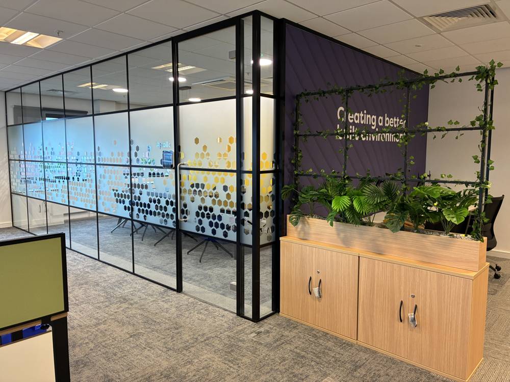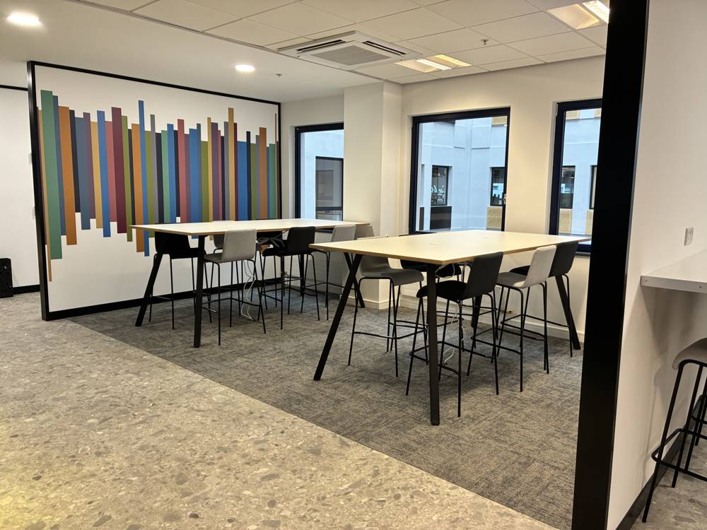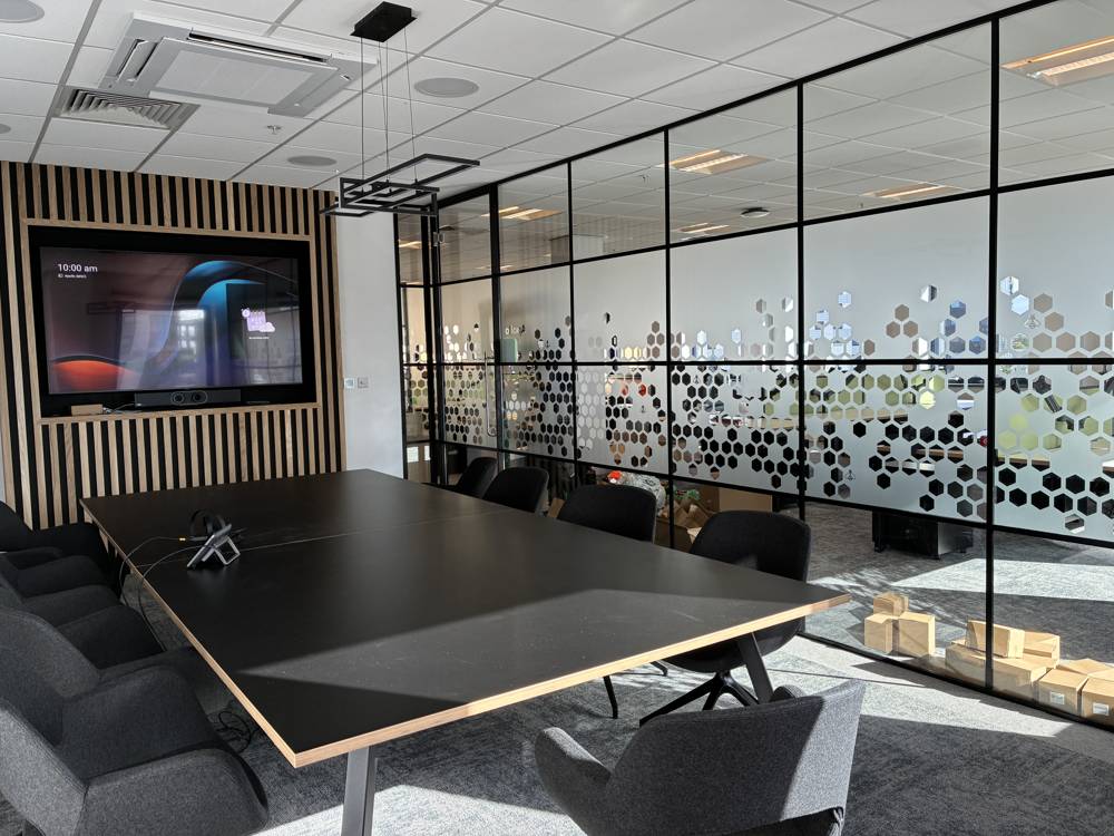A standout feature of the refreshed office is the meeting room, where a striking Maya Boardroom Table in black with ply-edging takes center stage. Positioned behind a sleek glass partition, this table provides an elegant yet practical setting for structured discussions and formal meetings.