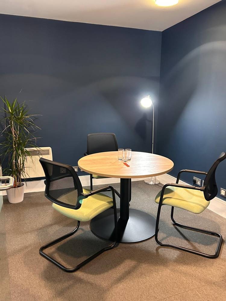 For collaboration and informal discussions, we created a dedicated meeting and breakout area featuring cantilever Phoenix chairs arranged around a sleek Trumpet Base Meeting table. This setup offers a comfortable, flexible spot for team conversations, quick catch-ups, or more relaxed client interactions.