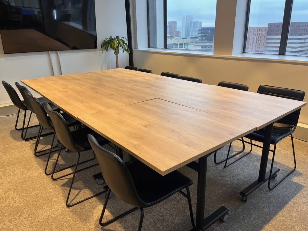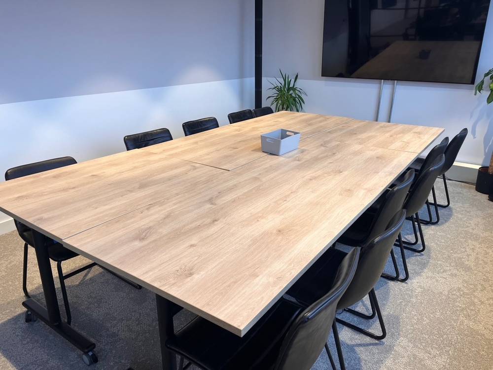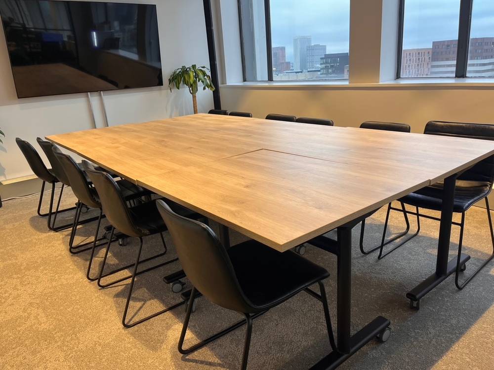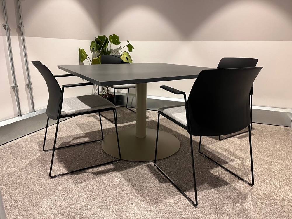 In a separate room, a Square Top Trumpet Meeting Table, finished in a sophisticated Anthracite and Olive Grey combination, creates a more refined environment for professional discussions. Paired with sleek Miami Sled Chairs, the space offers a clean, contemporary setting that supports focused meetings and client interactions.